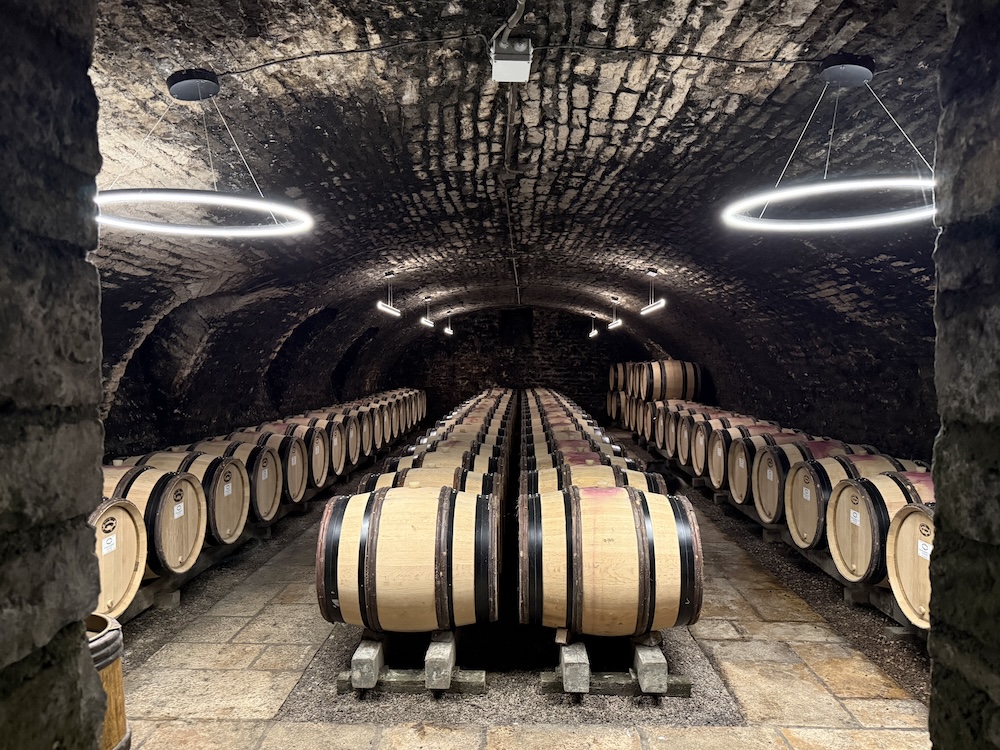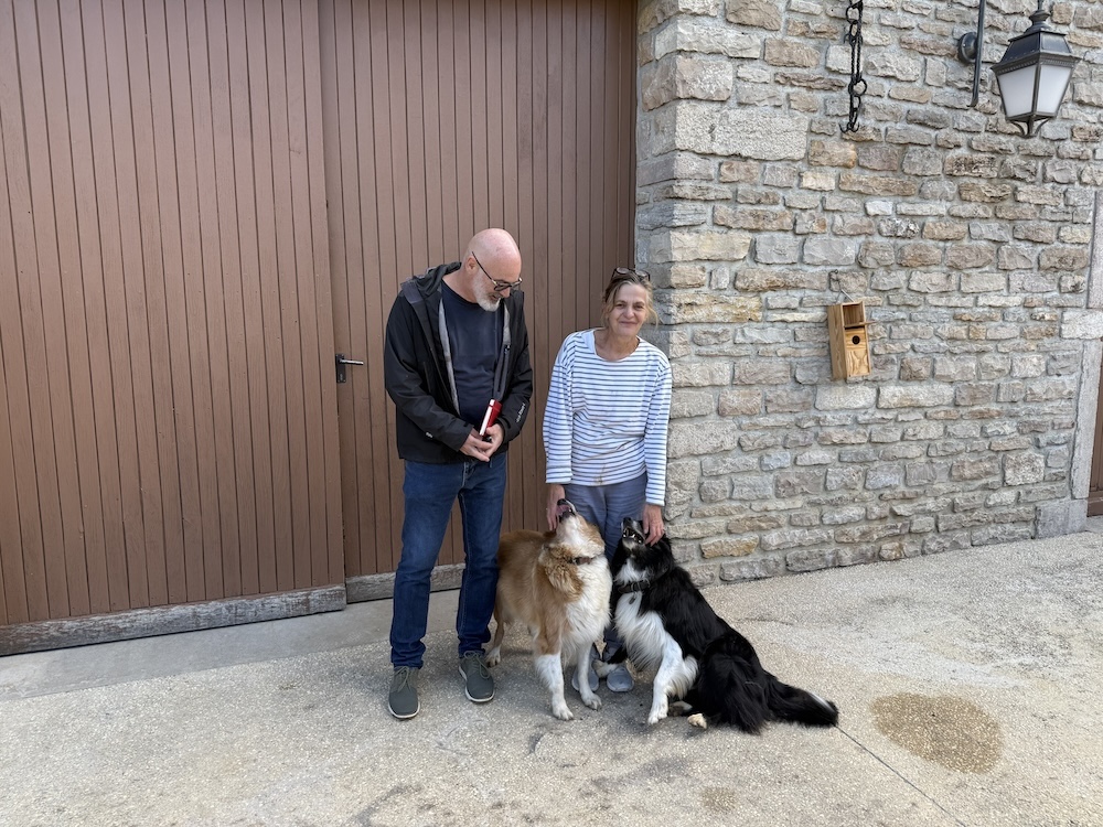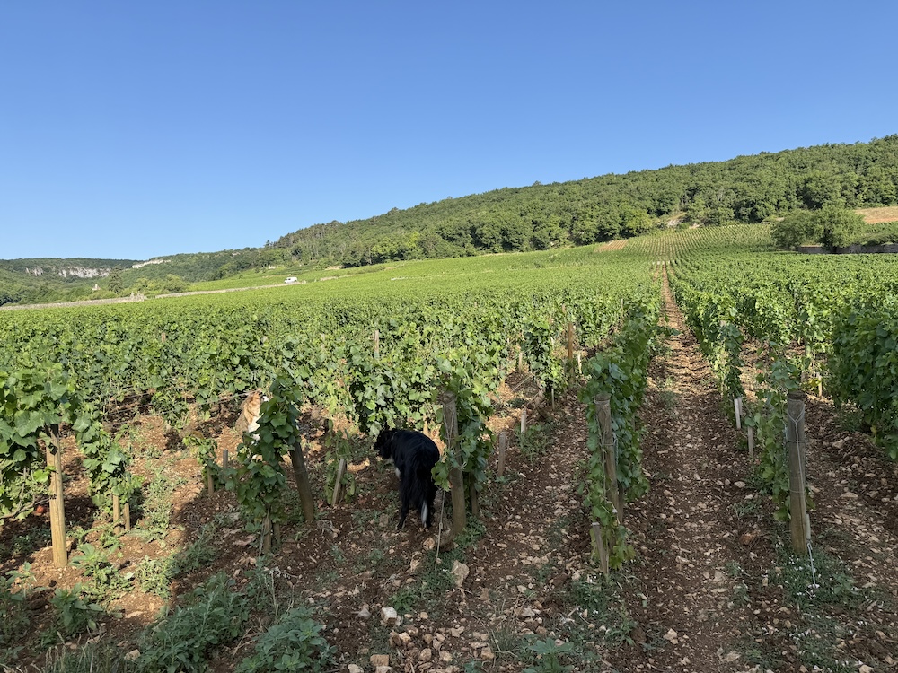 | Visite chez Sylvie Esmonin avec Justy et Sirius, les deux gardes du domaine. | Inspection des vignes par Sirius. Tout est sous contrôle ! | A la découverte de la magnifique cave aux trésors de Sylvie Esmonin. |